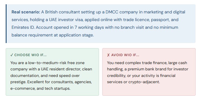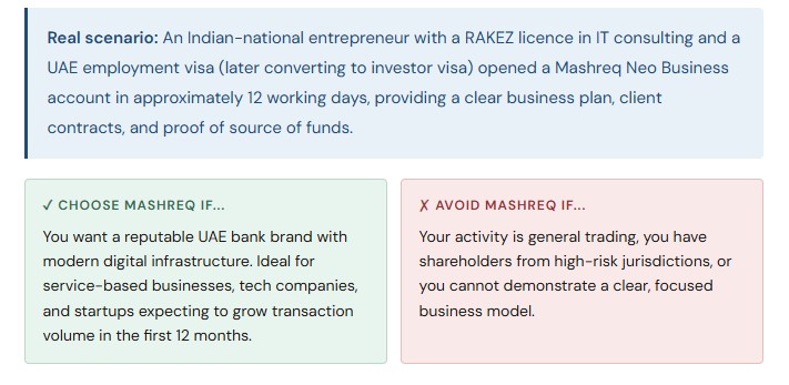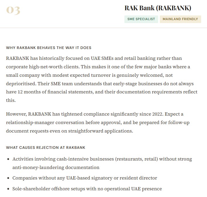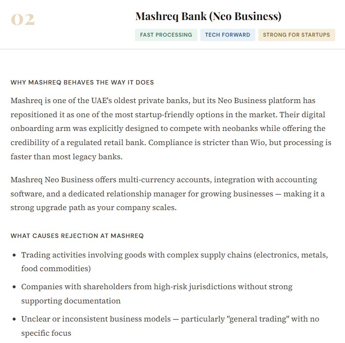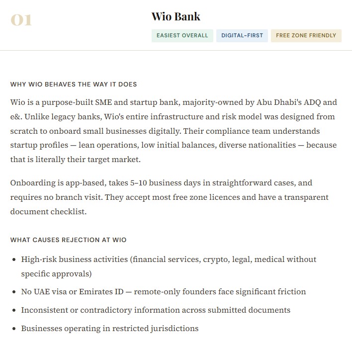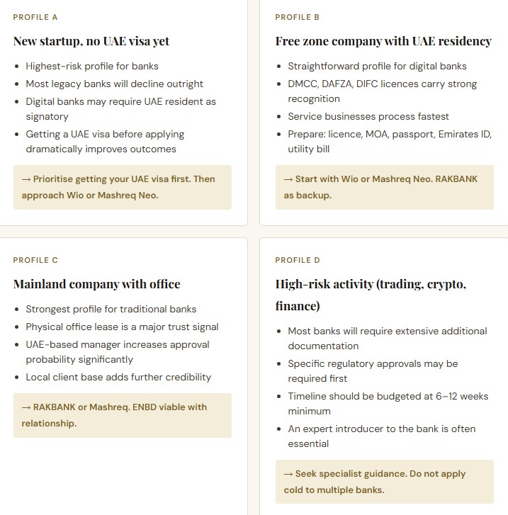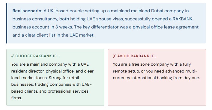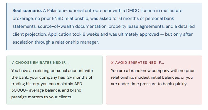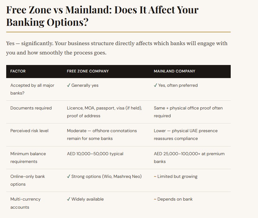 Free zone companies — particularly Meydan Freezone, DMCC, DIFC, and ADGM — are well-recognised and generally accepted by most major banks. Lesser-known free zones can sometimes trigger additional due diligence. Mainland companies, particularly those with a physical office, a UAE-based manager, and a clear local client base, often progress faster through compliance.