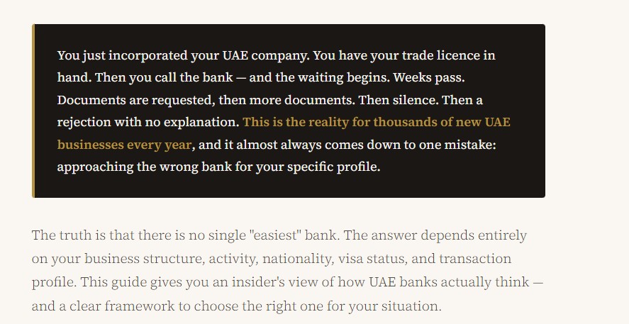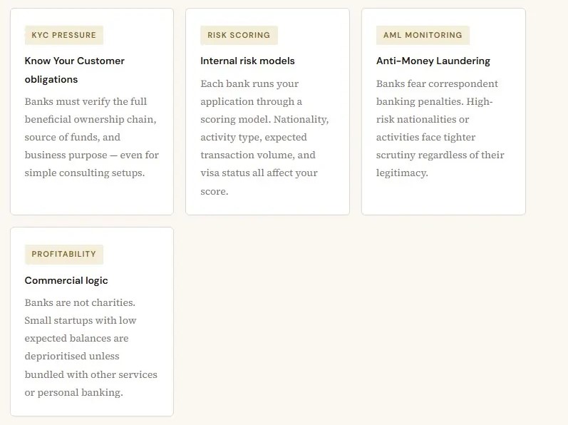 The UAE is a global financial hub, which means its banks face intense international scrutiny from regulators including the FATF, UAE Central Bank, and global correspondent banking partners. Since the UAE's 2022 FATF grey-listing (and subsequent exit in 2024), compliance teams have become significantly more rigorous. This has a direct effect on how quickly and easily new companies can bank.